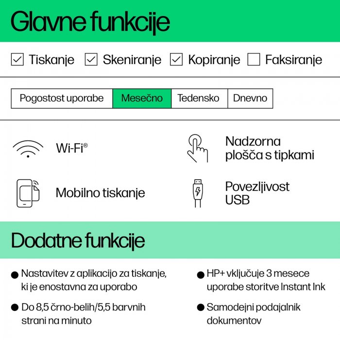 | Hitrost tiskanja dodatno | 5,5 str/min barvno, 8,5 str/min čb |